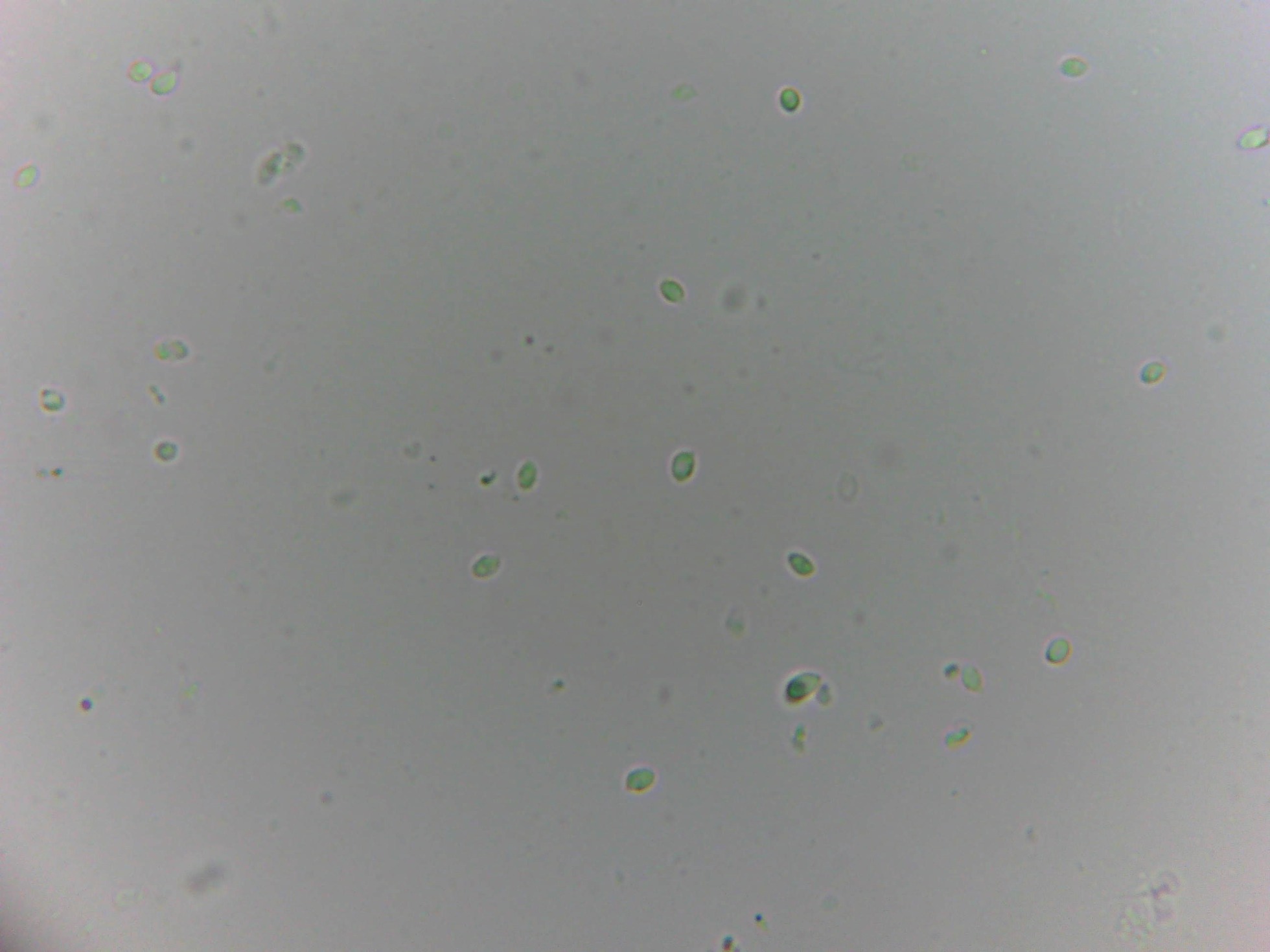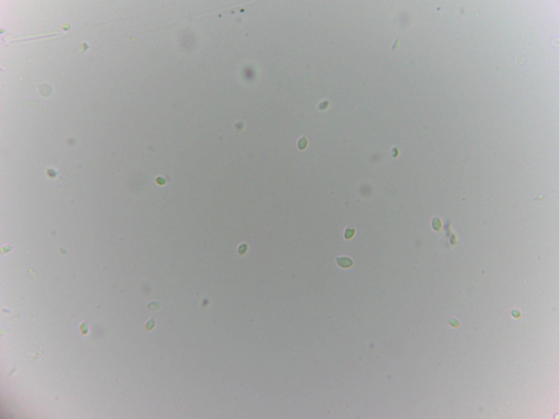 No obstante tengo alguna foto mas de esporas que las descarté al pensar que se podían tratar de la seta huesped, pero si parecen encajar con las que cuelgan de los basidios, pero insisto que tampoco cuadran con esporas del género Asterophora.