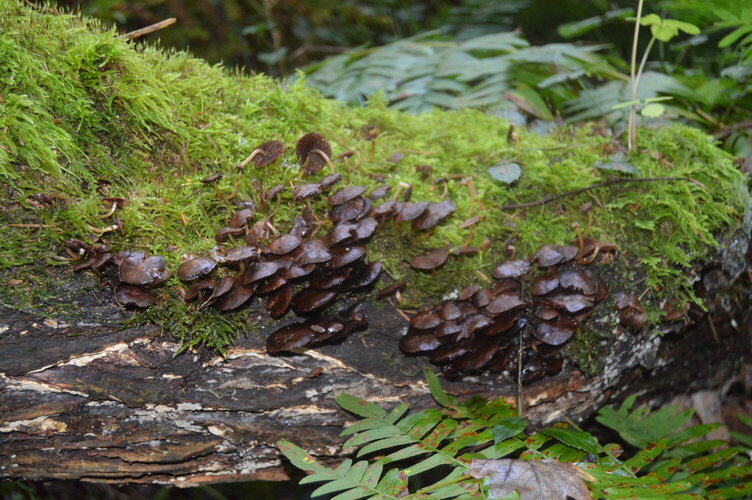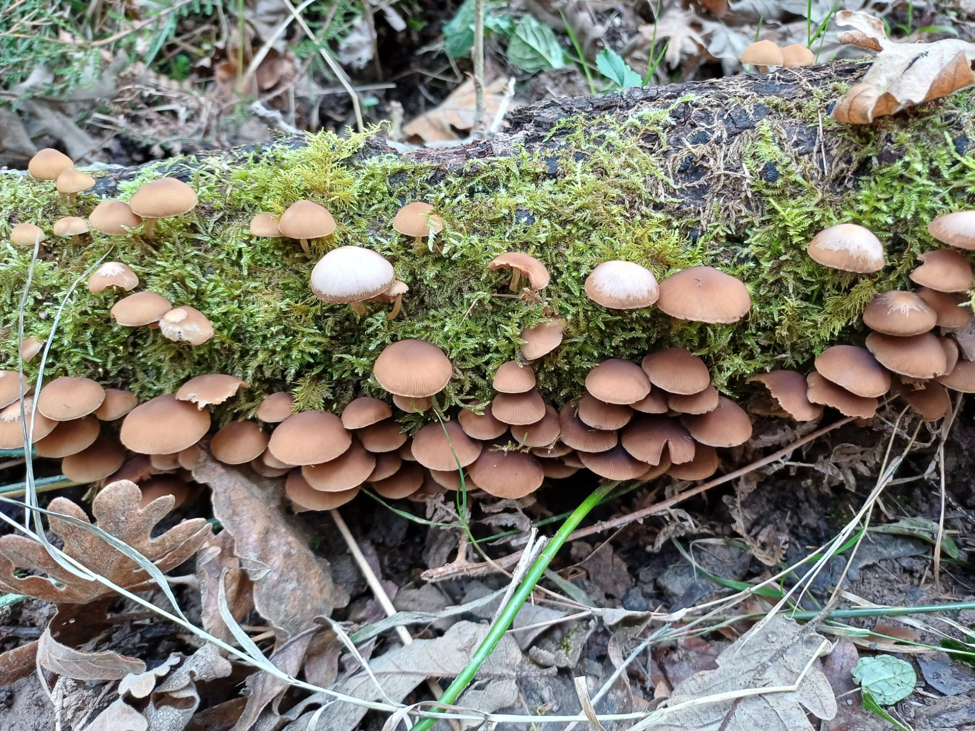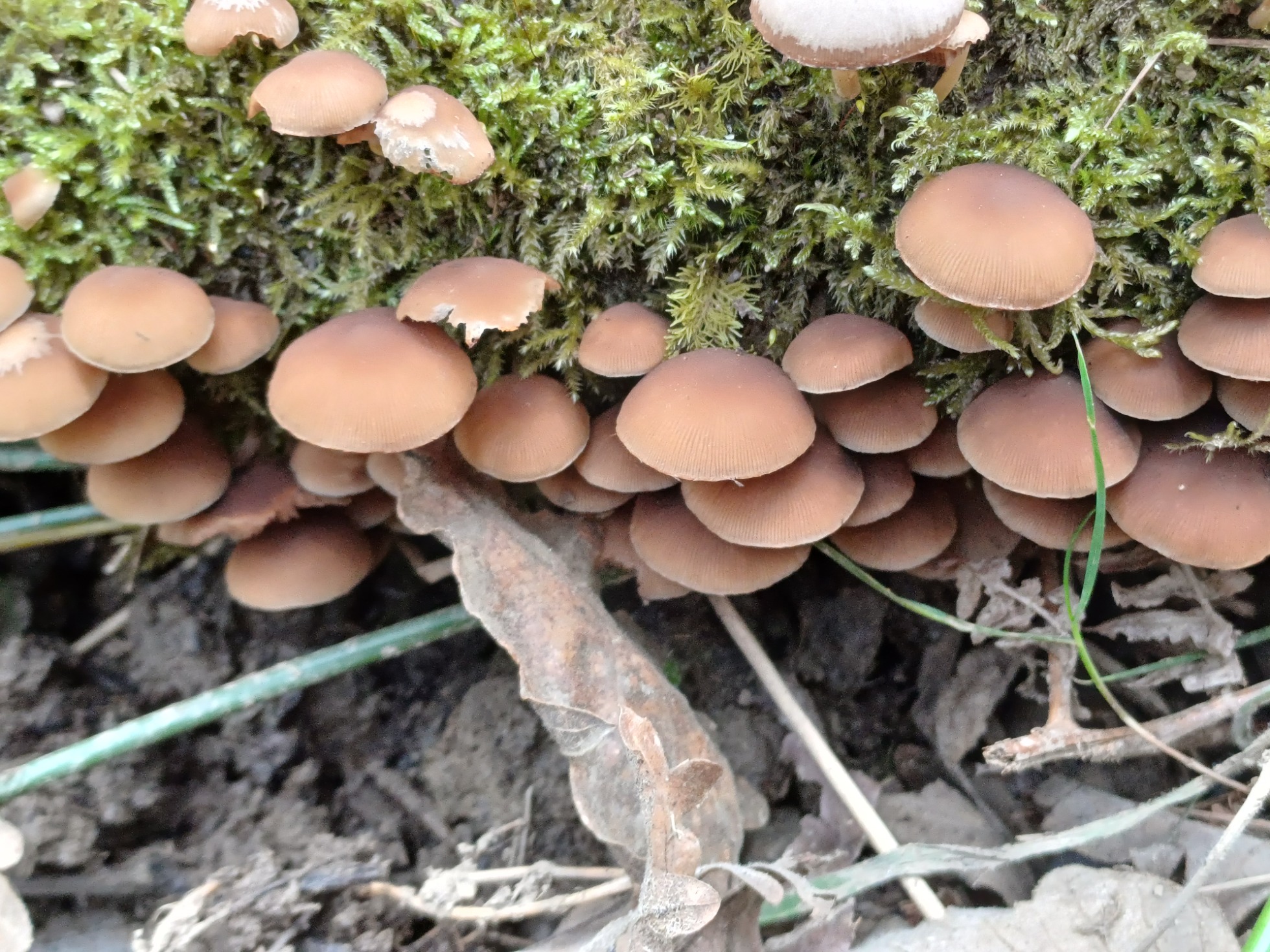 Atendiendo a la forma masiva que presenta y al color de las láminas de los dos ejemplares de la parte superior, aunque habría que comprobar si las láminas son o no delicuescentes (para descartar Coprinus), mi primera opción sería la de Psathyrella candolleana, muy embebida en agua, actualmente y por la ausencia de pleurocistidios denominada como Candolleomyces candolleanus, la he visto brotar directamente de la madera, tal y como se indica en la ficha de nuestra casa: