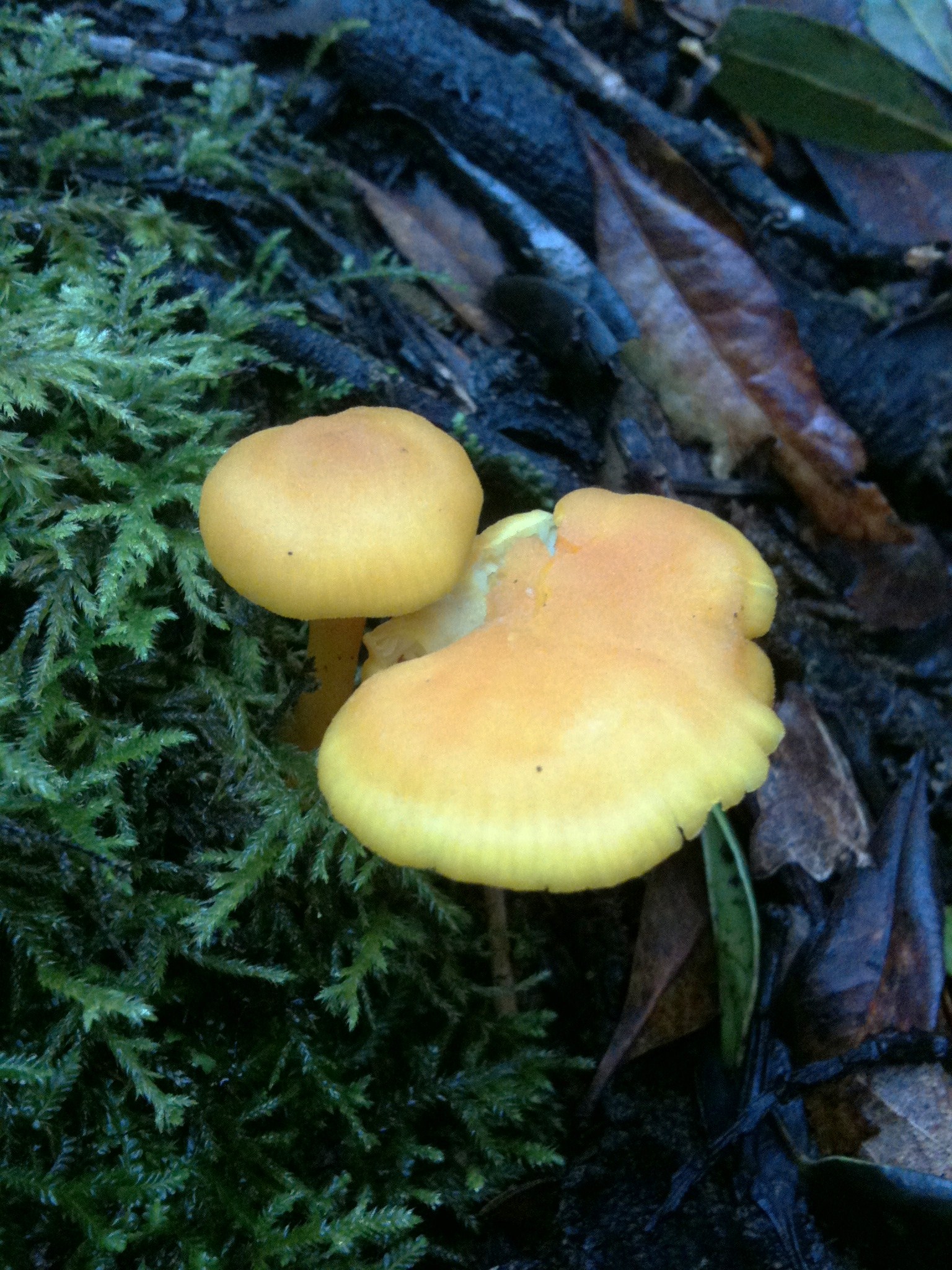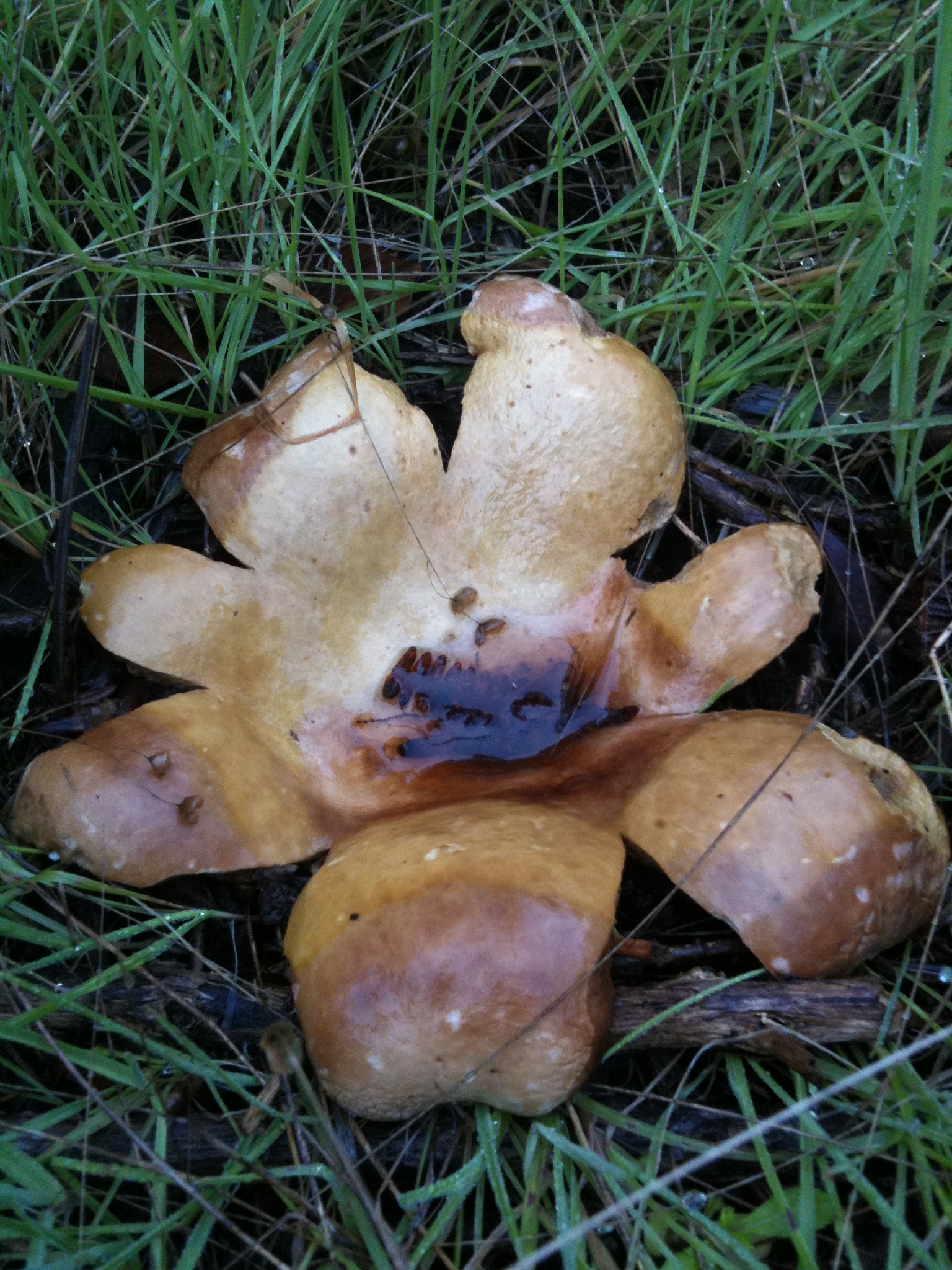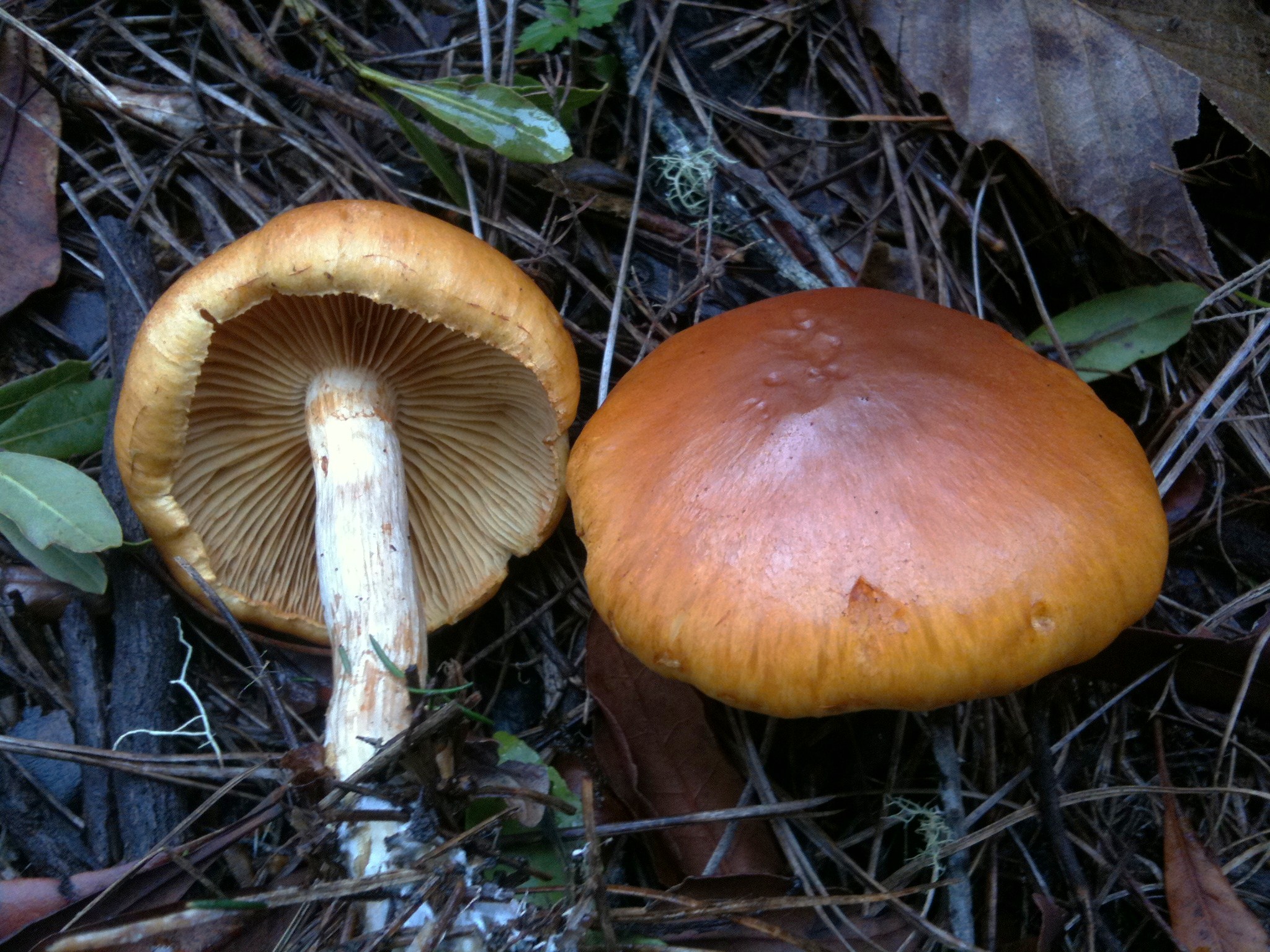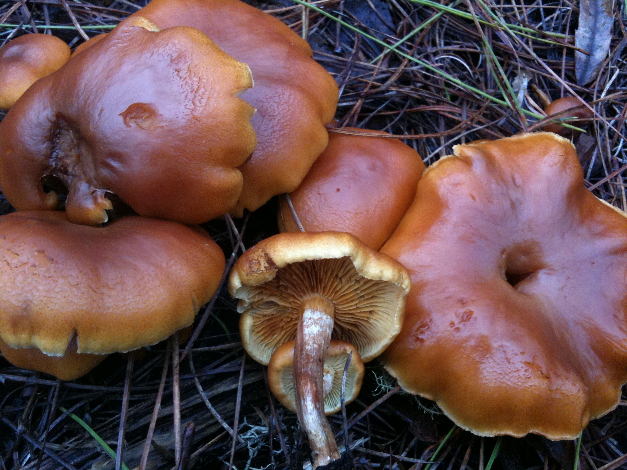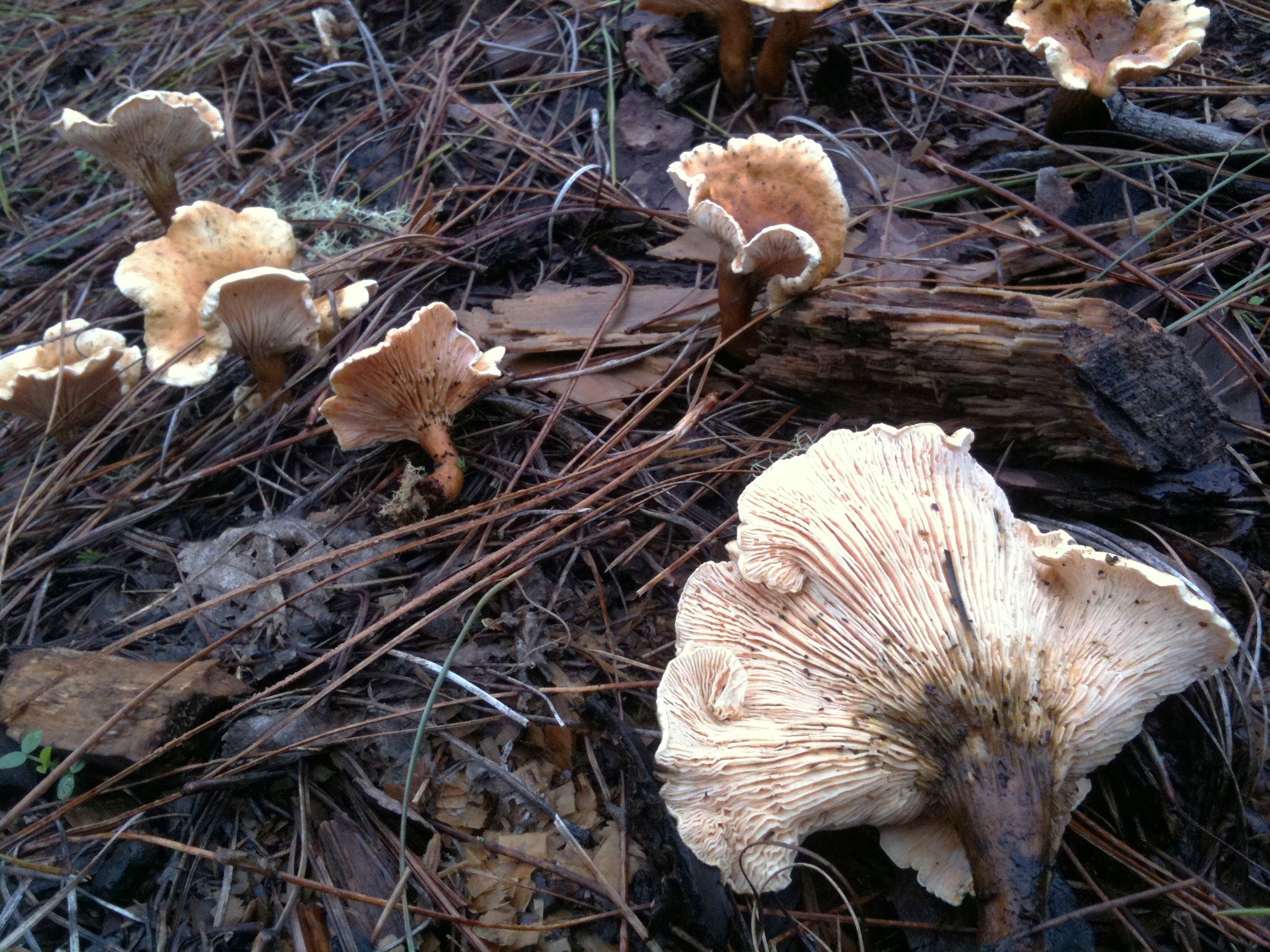 Menudo batibarullo, por ahí veo Hypholoma fasciculare, Hygrophoropsis aurantiaca, Pholiota pinicola, y algún Agaricus, que puede ser impudicus o alguno parecido, se precisan datos de si amarillean olor, etc...
