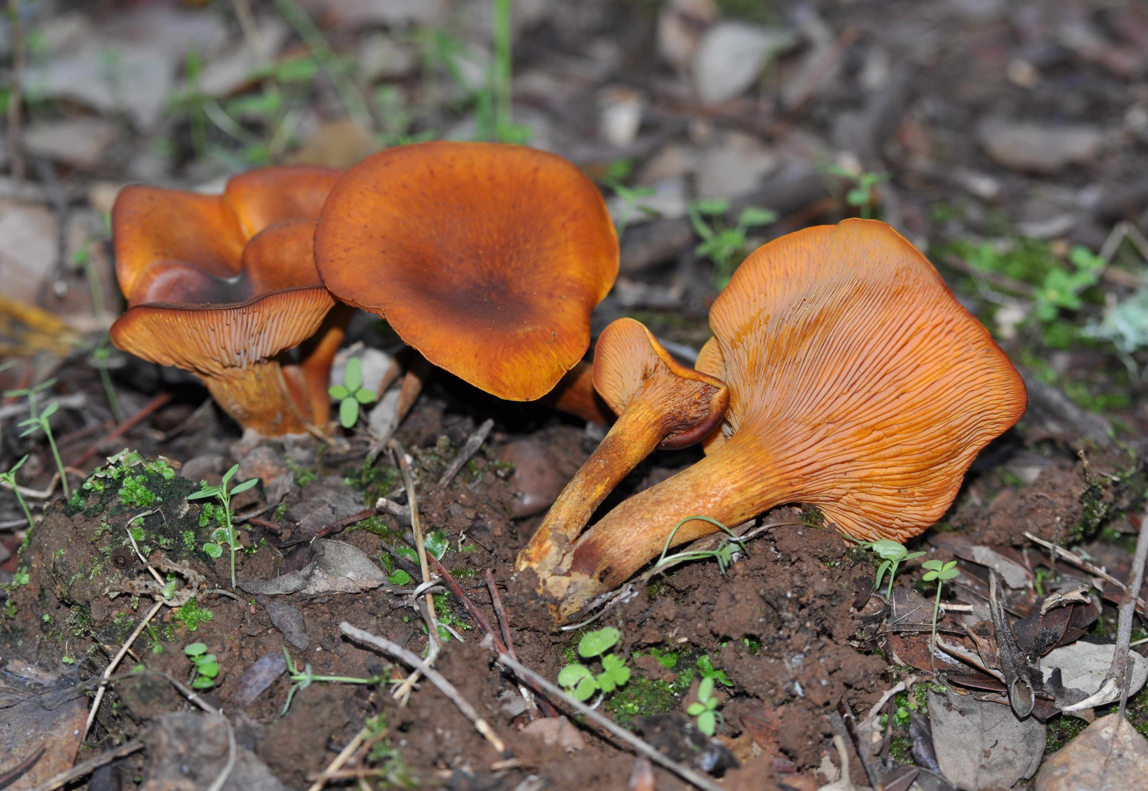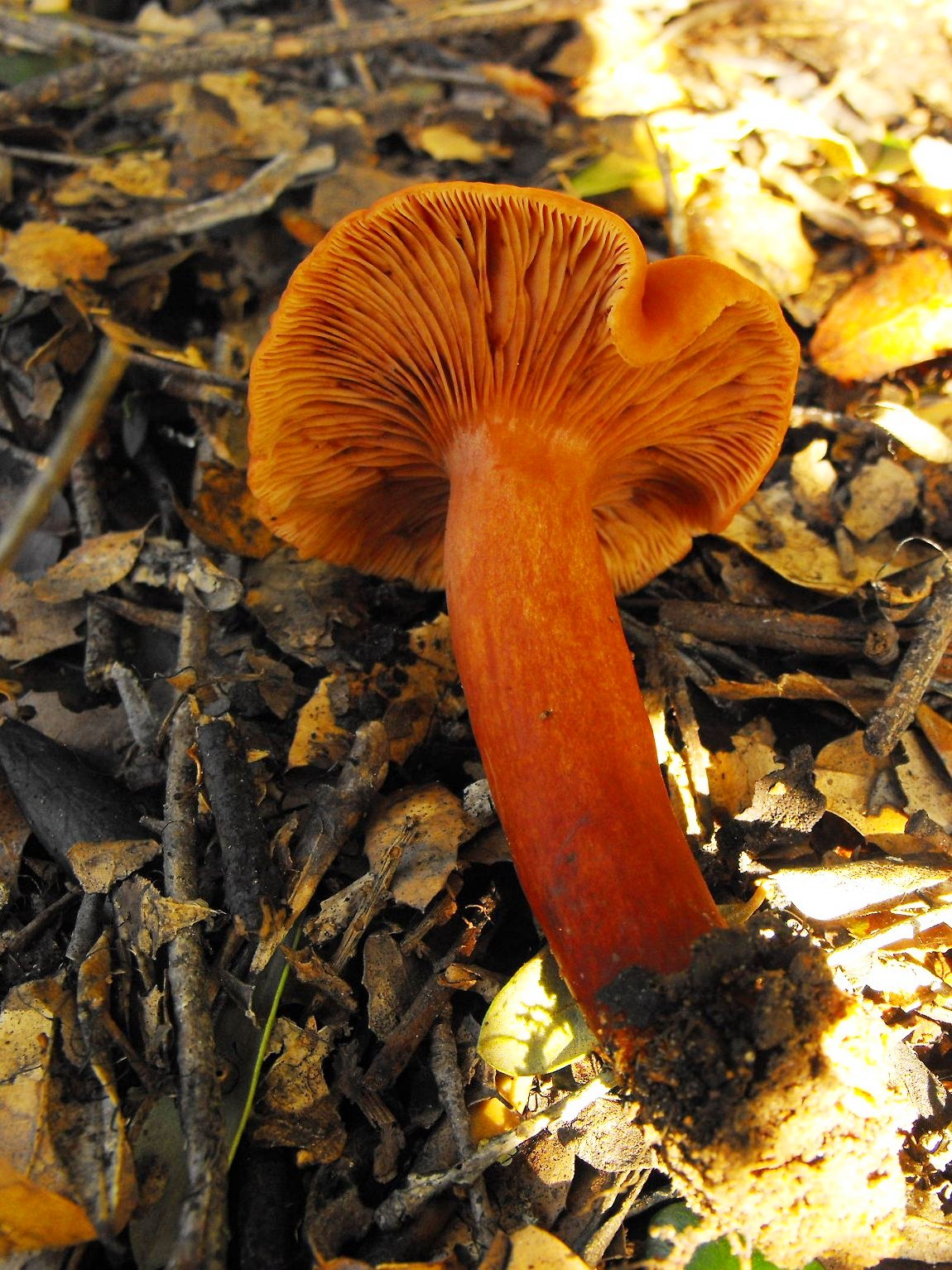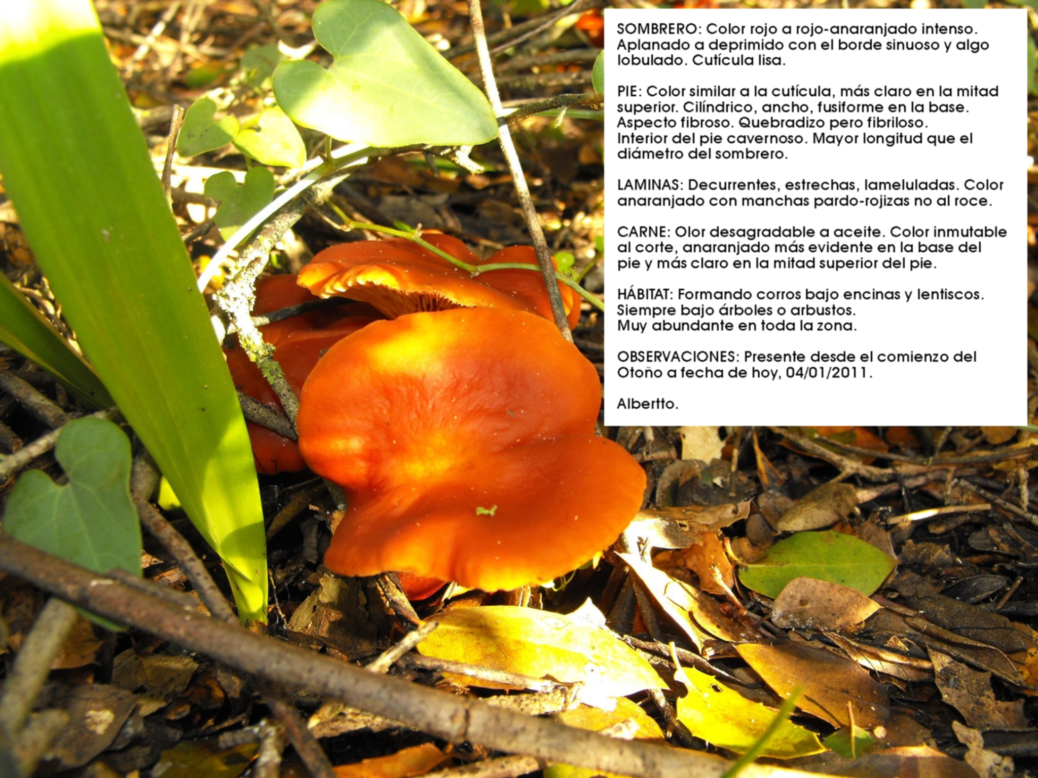 Alberto: te pongo un Omphalotus olearius. Este año había muchas, la he visto en casi todas las salidas, de octubre a noviembre.