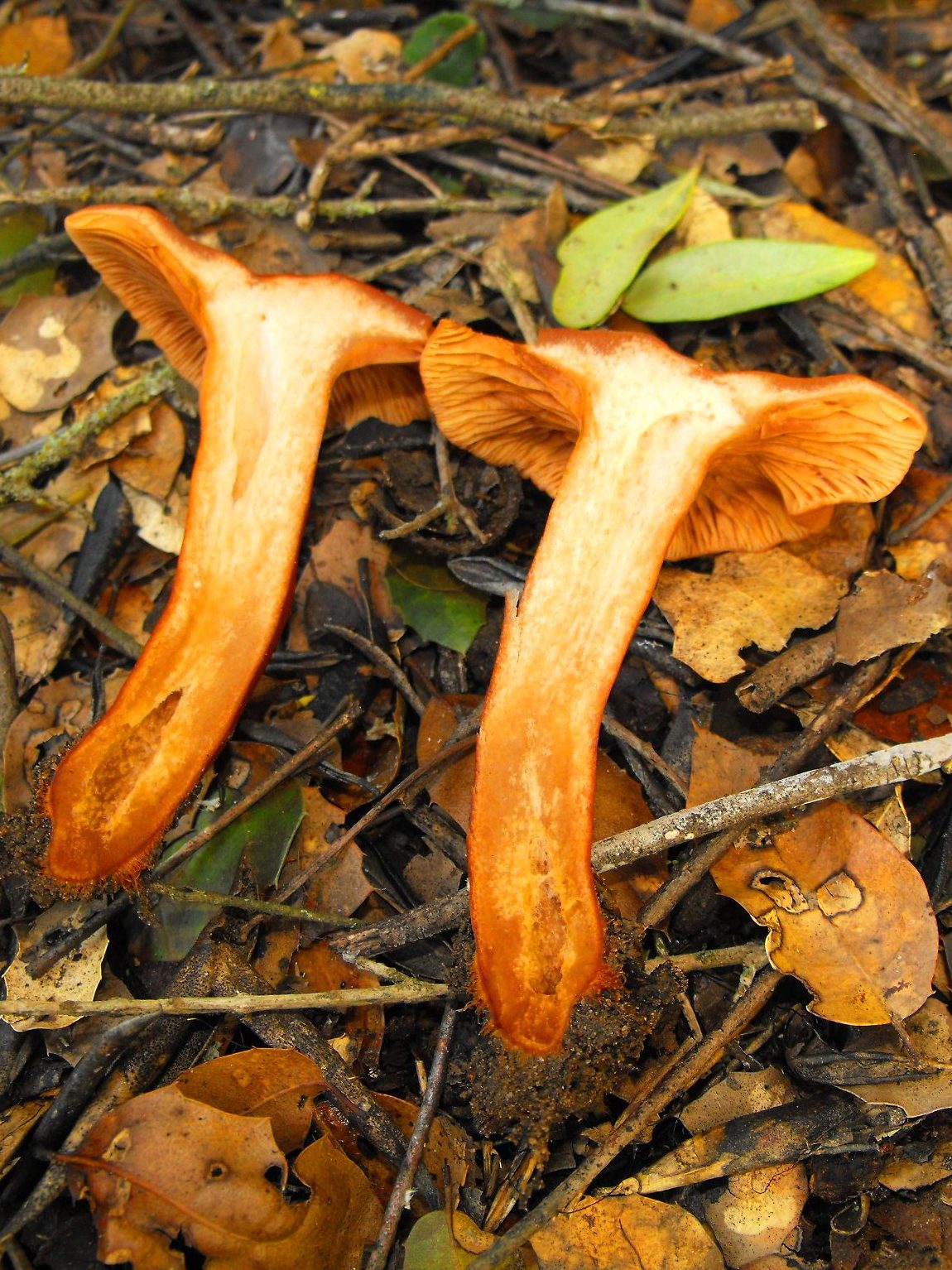Descarto Hygrophoropsis por el margen, que creo es más involuto en estos géneros y la forma del sombrero, junto al hábitat.