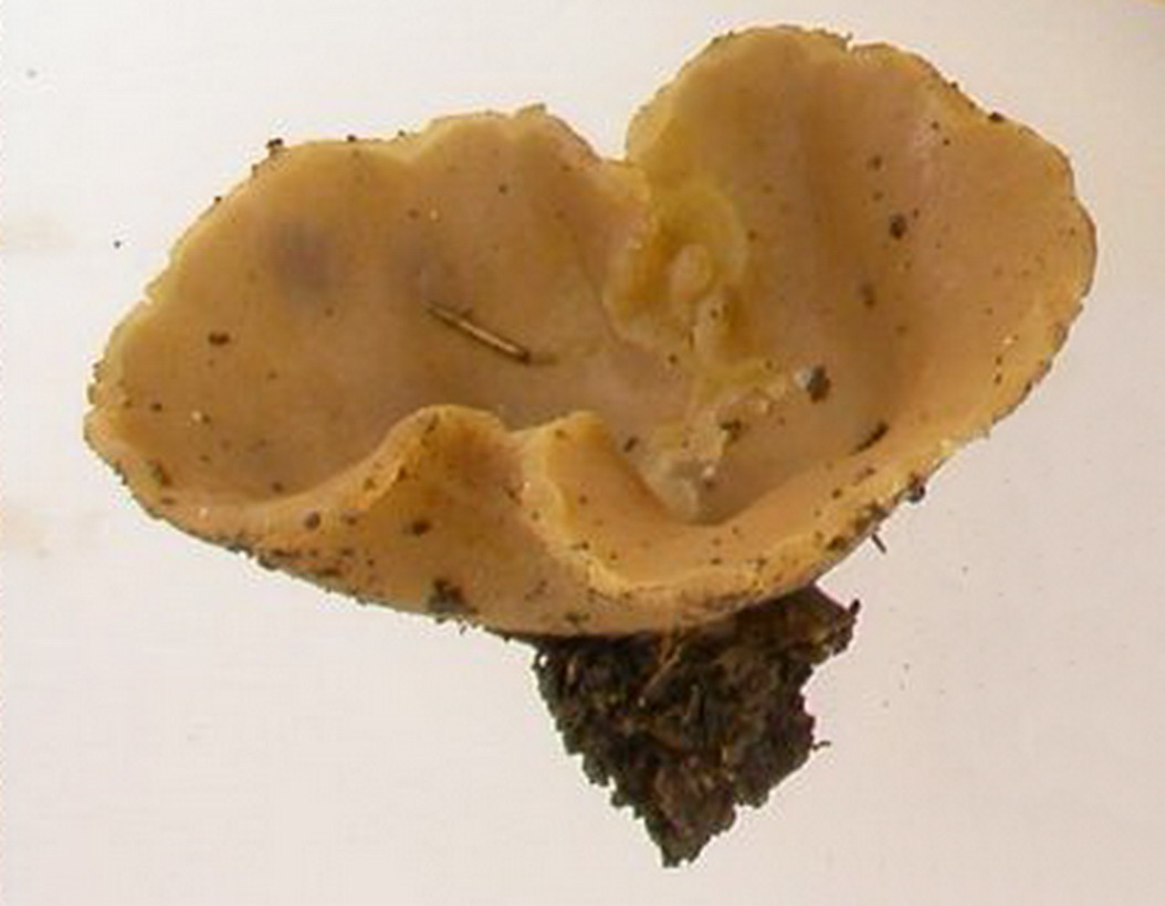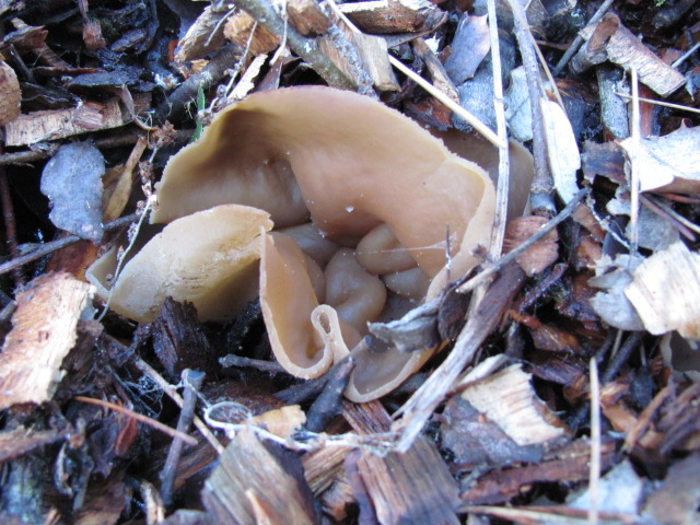 esta otra bajo encinas,entre virutas y madera en descomposición. me inclino por peziza ,había bastantes ejemplares y de unas dimensiones de 10 cm.de diámetro,color beig opaco,textura quebradiza olor no se describir pero parecido a las de sus hermanas ,pensé en otidea pero creo que esta especie presenta una apertura,alguna idea???