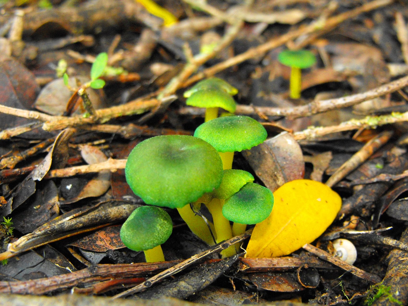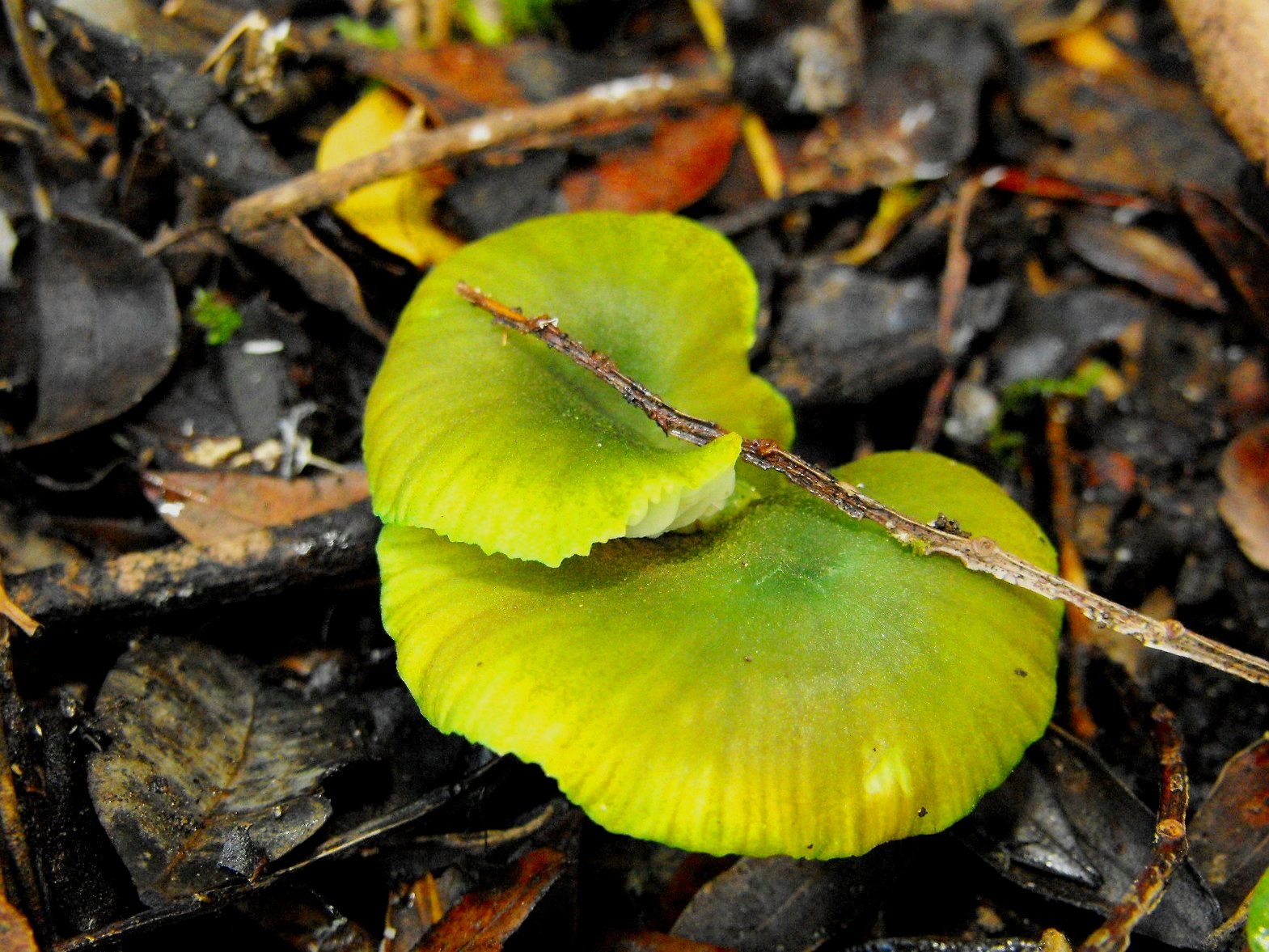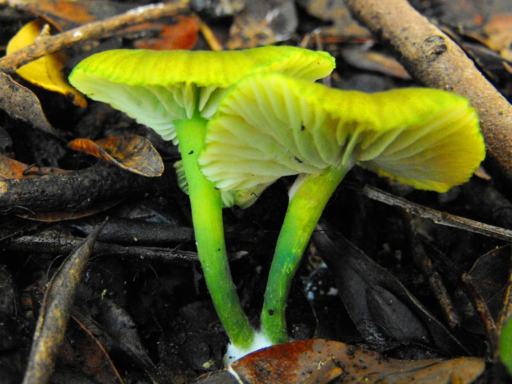 La que más me cuadra es H. Psittacina.Pero tengo mis dudas por la forma del sombrero, que no parece campanulado. Le veo forma típica de Clytocybe, pero no he encontrado referencia a esa coloración verde.