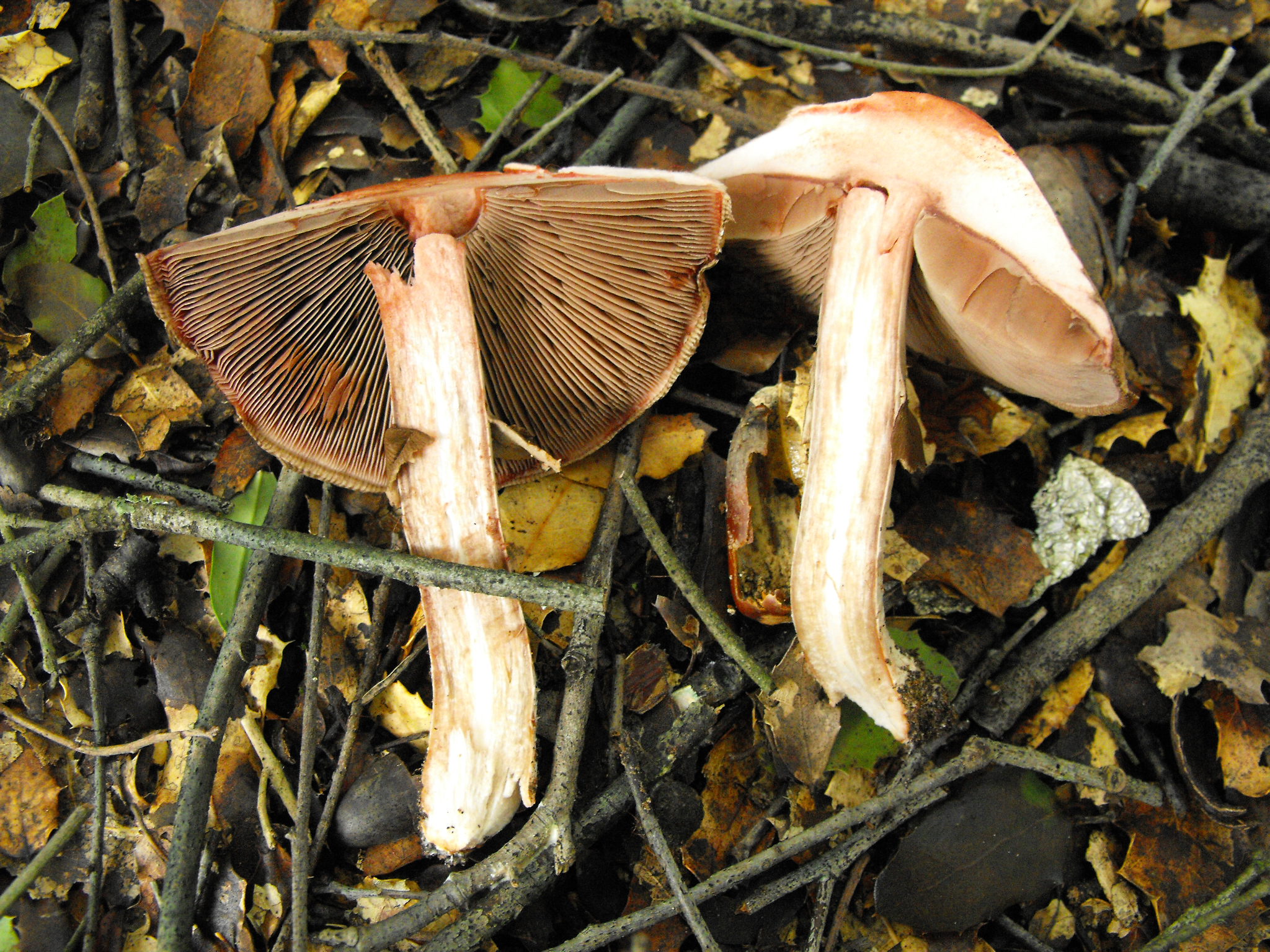 Láminas: libres, anchas, de color carne-asalmonado, con presencia de lamélulas. Margen liso. Manchas de color rojo-sangre por roce.