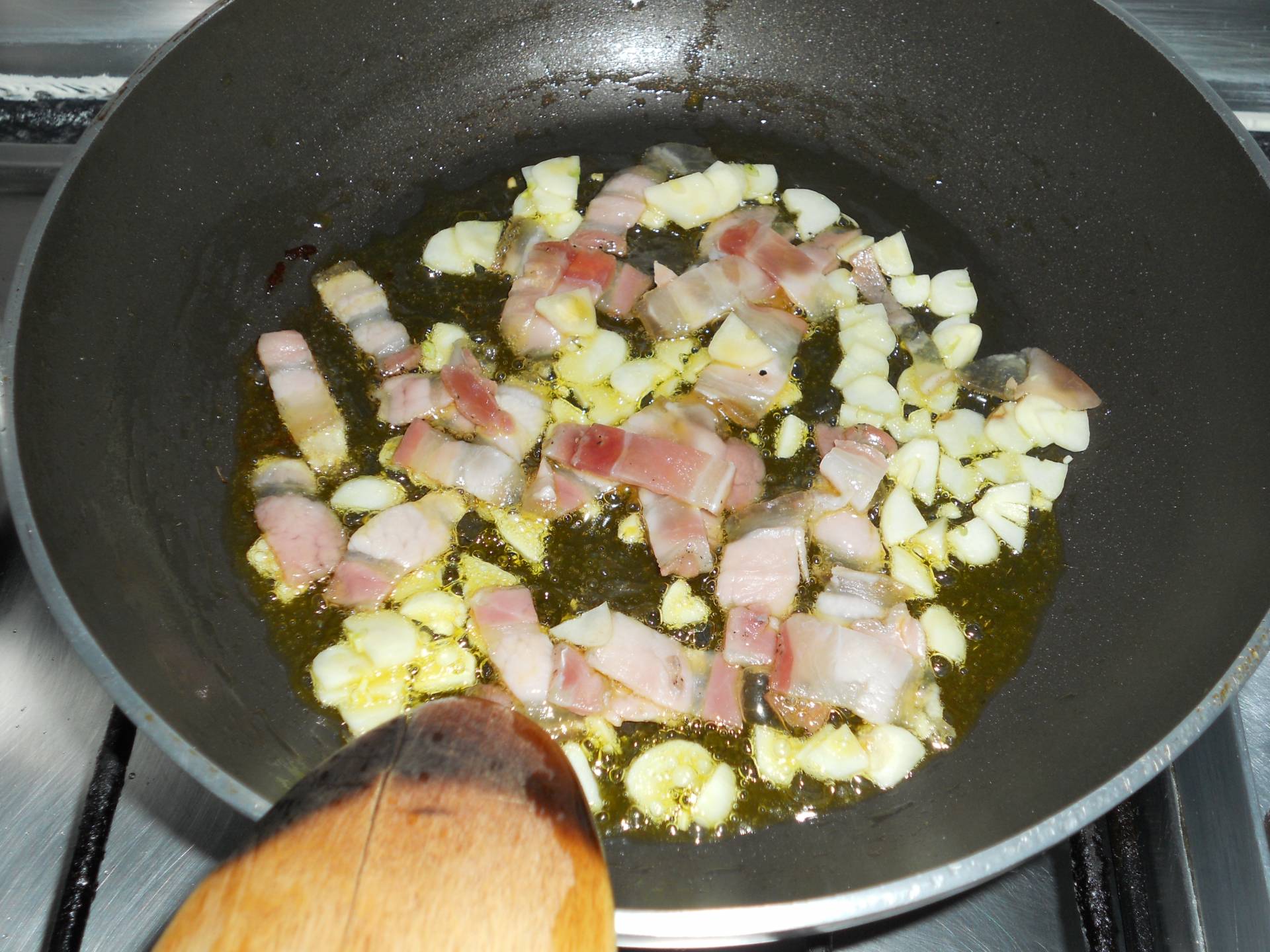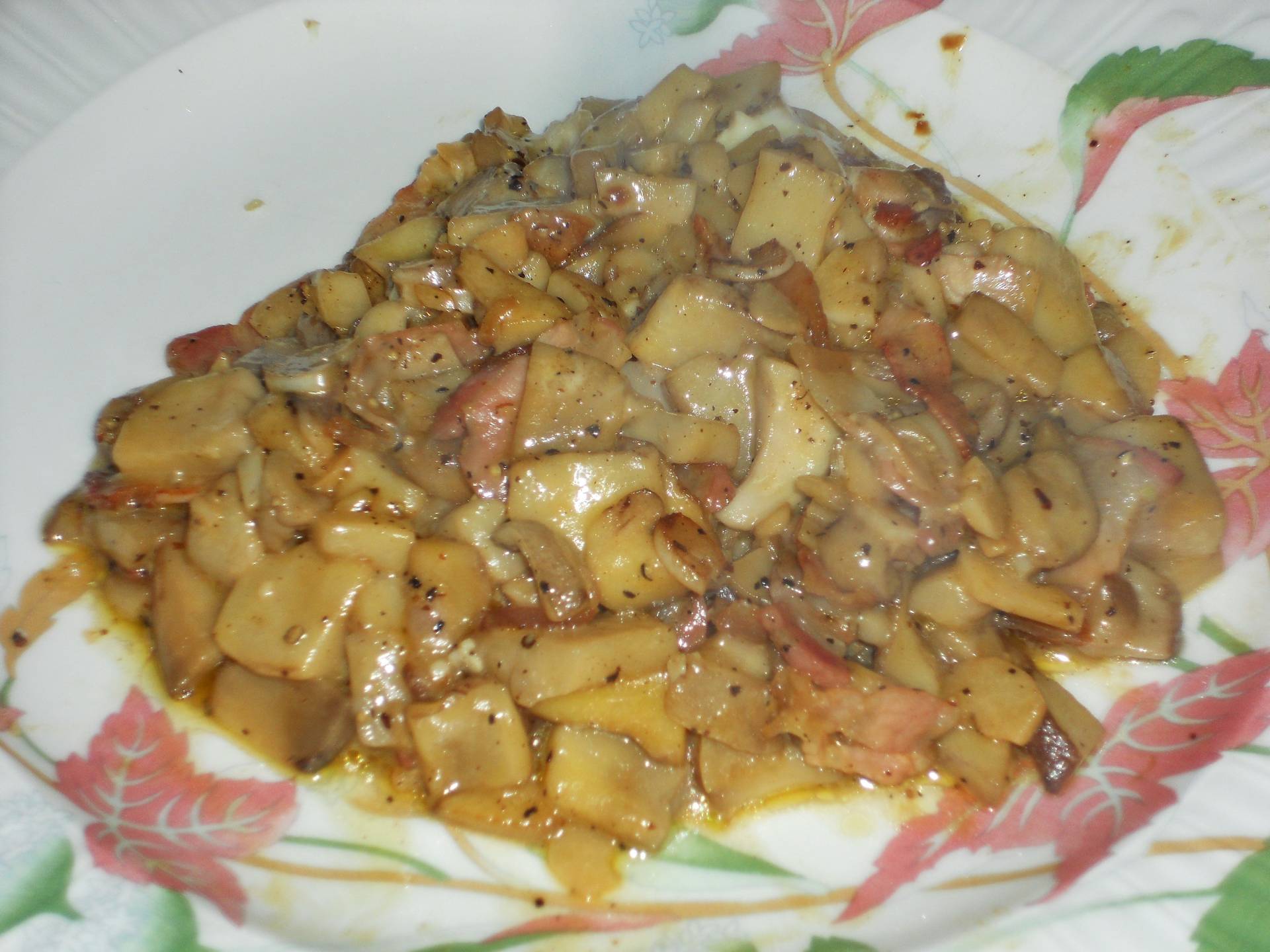 La receta: Sofrito de ajos con bacon, una vez doraditos se le añaden los tacos de Suillus y se rehogan hasta que pierdan el agua, se le añade sal y pimienta al gusto y a servirlos en la mesa.