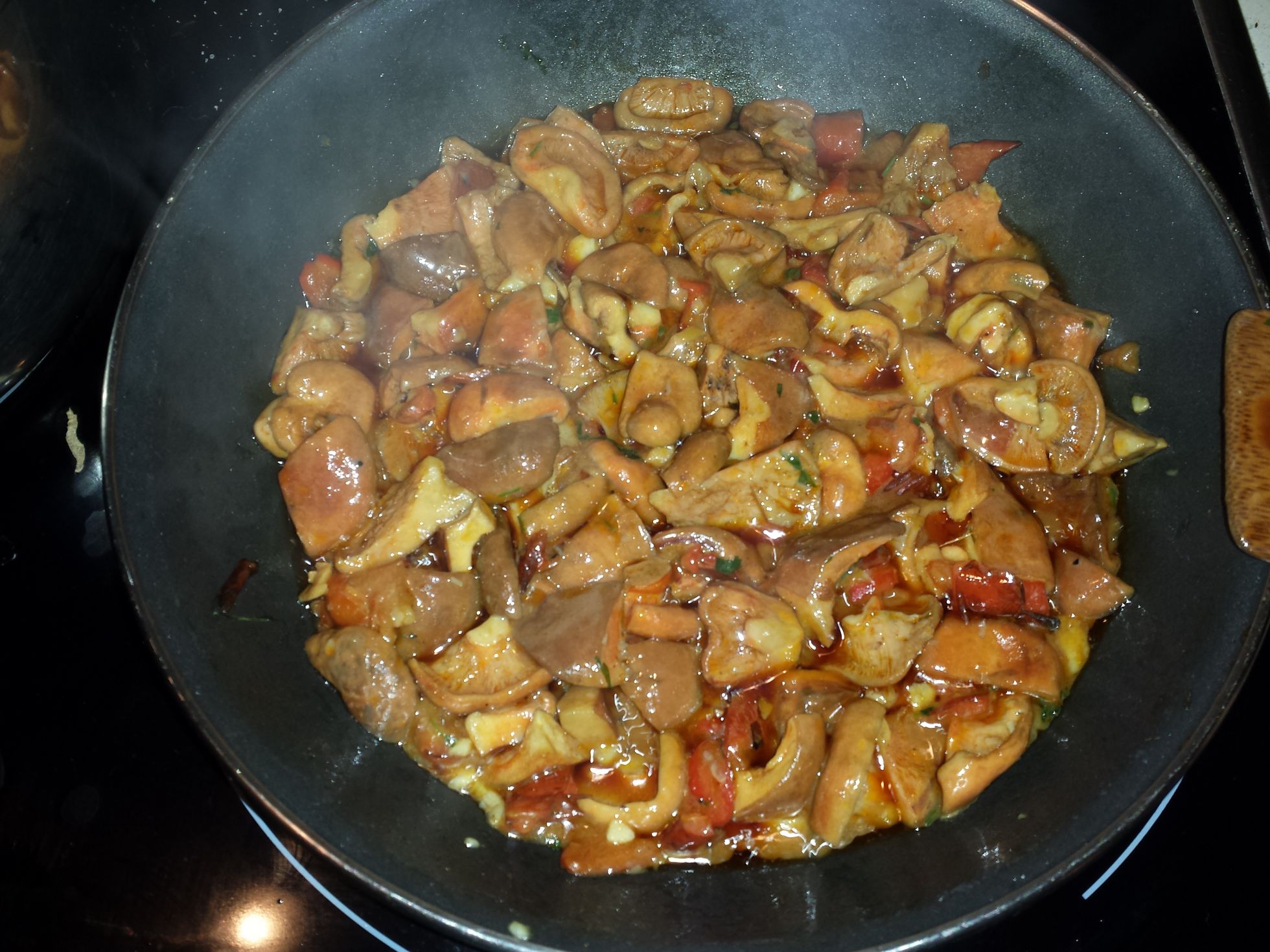 Los pimientos rojos combinan muy bien con los niscalos por sabor y colorido, te adjunto una foto que puse en el foro general hace unos dias.