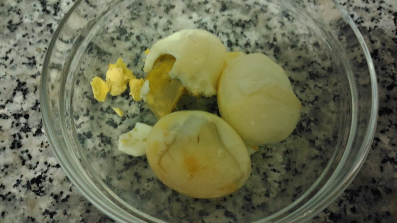 Pues resulta que dejé cociendo tres huevos y se me olvidaron...vamos que estuvieron casi dos horas hirviendo y han terminado achicharrados....esto ha sido lo poco que se ha podido salvar.