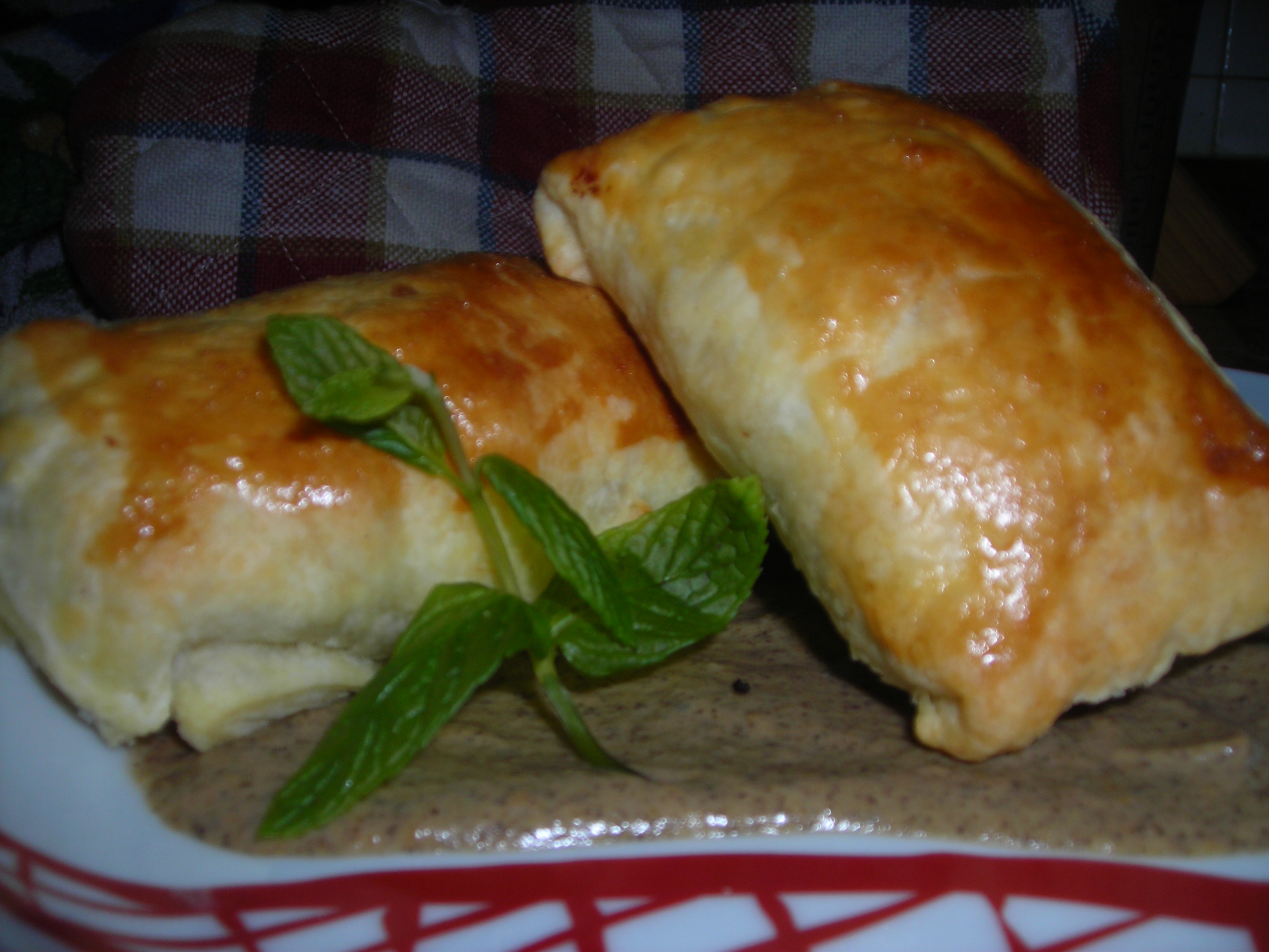 Extendemos los hojaldres, le hechamos una cucharada sopera del relleno,(siempre a lo largo), y le damos dos vueltas al hojaldre de manera que en la parte de abajo nos queden 2 capas y no se salga el relleno, cerramos los costados hacia abajo y lo pnemos en la bandeja de horno.Untamos de huevo y lo metemos al horno de 10 a 15 min, (se ira comprobando que no se quemen por arriba),el horno previamente precalentado a 180 grados, funcion abajo y aire arriba y para emplatar rellenar el fondo de um plato de salsa y colocar encima.